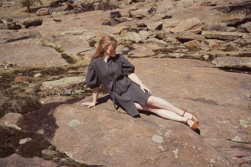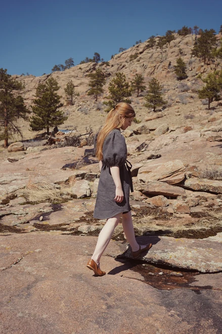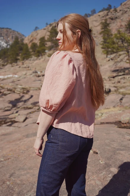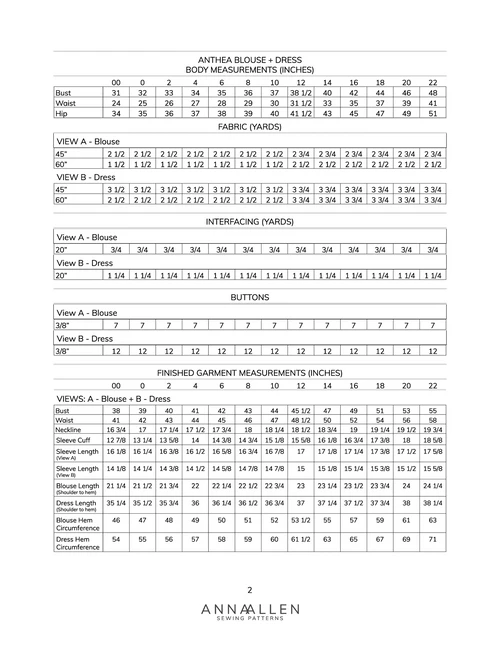 The Anthea is a dartless blouse and dress pattern with puffed sleeves. All views button up the front with a fold-over placket and bias faced neckline. View A blouse has puffed sleeves that end at, or just below the elbow with a narrow bias cuff. View B dress has puffed sleeves that are 2” shorter than view A. Both the blouse and dress have a narrow curved hemline that dips down at the back/front and comes up slightly at the side seams. The dress includes a separate tie for those who prefer a more cinched in waist. This pattern was drafted for someone 5’5” with a B/C cup. Both top and dress can be lengthened or shortened as desired. Intended to be made in non-stretch woven fabrics.
