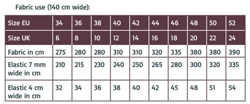 - fabric: see table below