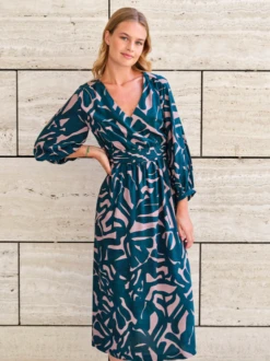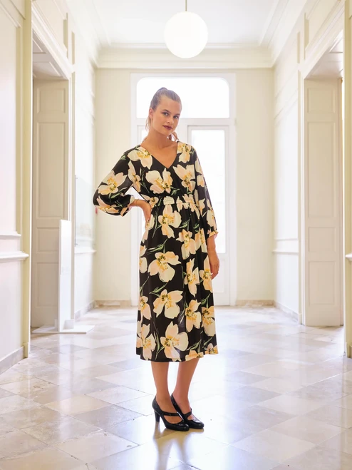 Alana dress is an elegant dress with a V-neckline, wide sleeves and a swirly skirt. There are three options for the waistband: a pleated one, an elasticated one with 3 elastics to get a smock effect, and a flat waistband. The back is always elasticated, so there is no zipper. Alana is best in a viscose or fine cotton.Â