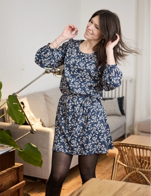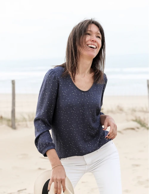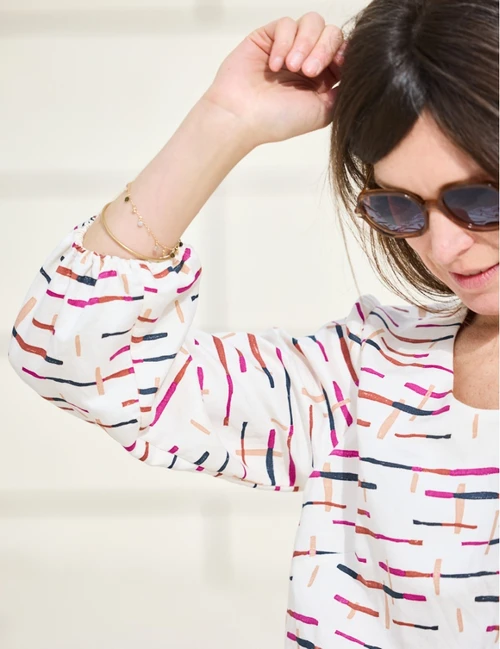 Minimalist blouse with a round neckline. On the back, the buttoned keyhole opening brings a refined touch, while remaining optional. The puffy sleeves are finished with a wristband or an elastic band. It can also be made into a tunic-dress to be worn with a belt, and with or without sleeves.