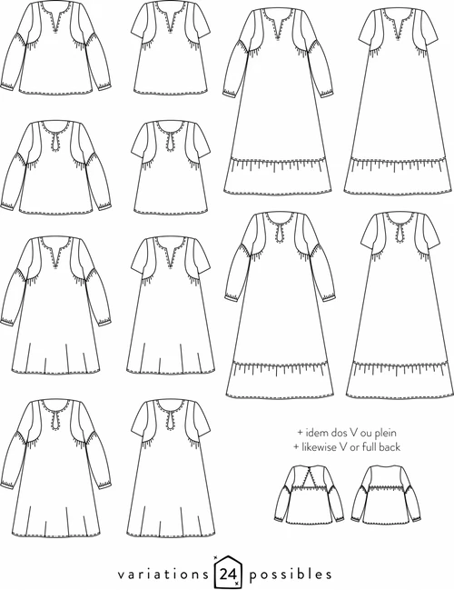 - Fabric (dress version): add +70 cm (=28 ”) all width (short dress) or +180 cm (=71”) all width (long dress) from blouse version