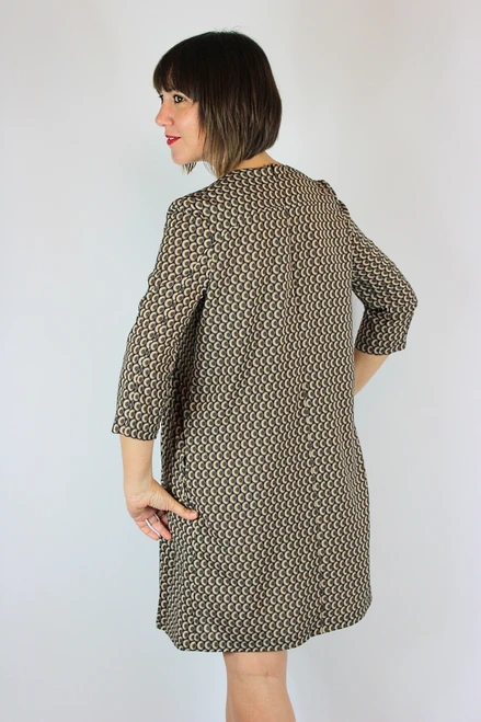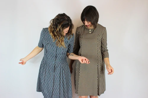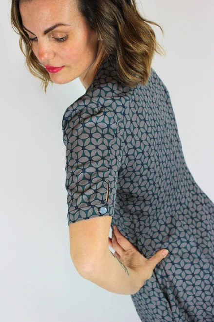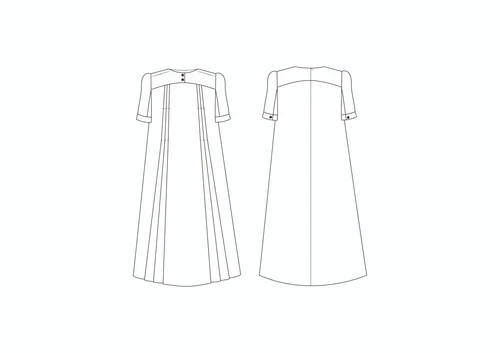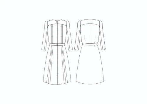 Dalila is a feminine dress with a romantic flair. It comes in two versions and two different styles with one common feature – beautiful pleats! Version A has a figure-hugging silhouette and pleated bodice and skirt, with a cinched waist and button down front with a hidden placket that gives a touch of elegance to the dress. The more casual version B has a relaxed flared silhouette, with pleats down the front and an invisible zipper at the back. There’s also two sleeve options: 3/4 sleeves or short sleeves with a cuff and vent. Both versions feature a yoke (front and back) with a curved seamline that continue to the sides of the sleeve to create a beautifully balanced look of the bodice. In both versions pleats are secured in place with decorative hand stitches, just above and under the bust, to provide some gentle shaping.Â