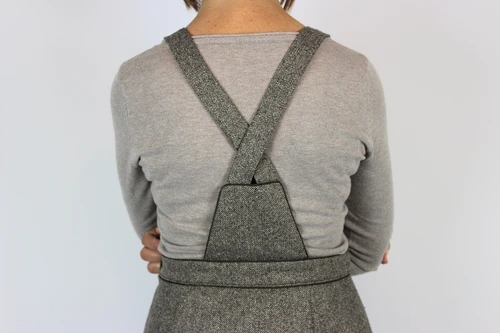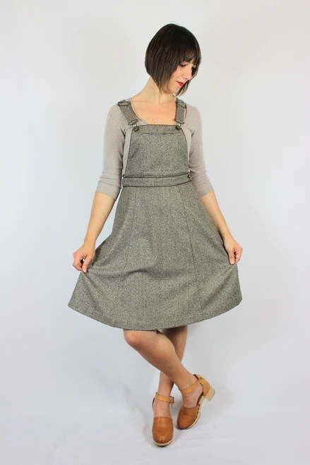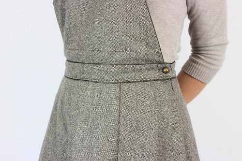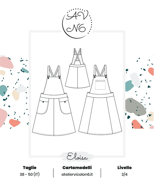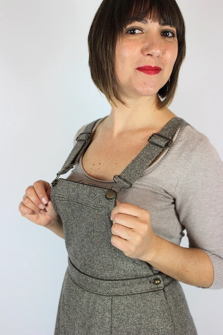 Eloisa is a timeless dungaree dress with a vintage flair. It features a bib at front and back, adjustable straps, fitted waistband with side zipper and and two skirt options. Eloisa is available in two versions; Version A features 4 panelled skirt with a centre seam at front and back, and two-piece patch pockets with button and loop closure; Version B features 6 panelled skirt and front bib with a double welt pocket. Both skirts are flared and come in two lengths: mini or midi, depending on your taste.Â
