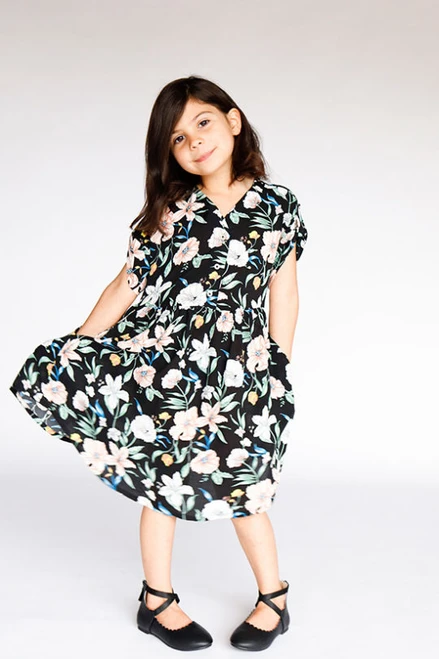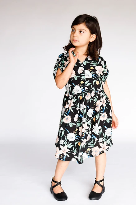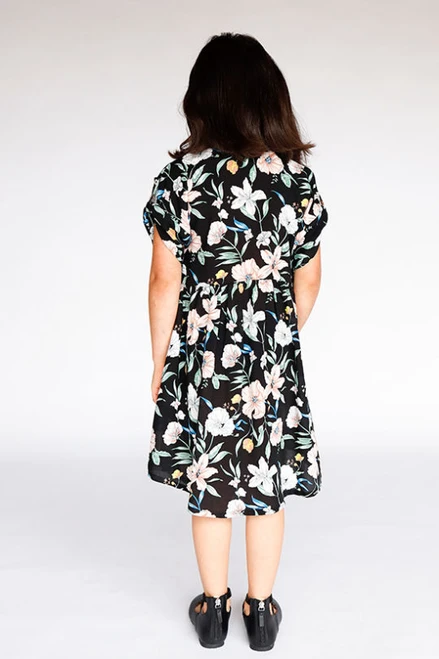 The Mini Fringe pattern is a woven dress and blouse with two views. View A has a button up front with a neck facing, elbow sleeves and tabs. View B has a pull over, notched front and a fully lined bodice with cuffs. Both views include optional waist ties, and the sleeve & cuff are interchangeable.
