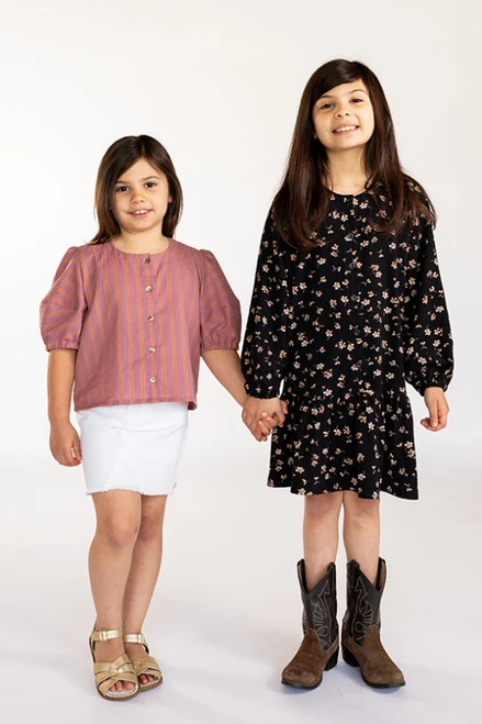 The Mini Wren pattern is a button-front blouse and a mini dress. The mini dress has a dropped waist with a gathered skirt and is loose through the waist and hips. There are two statement sleeve options. A short sleeve with a puff cap and a long sleeve, both with an elastic hem.