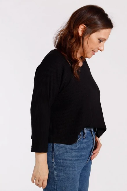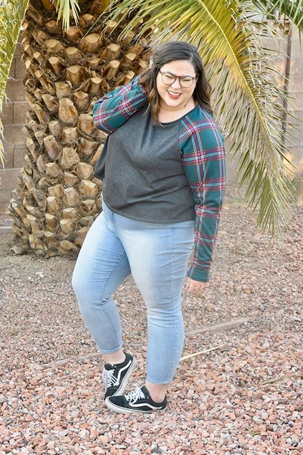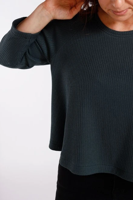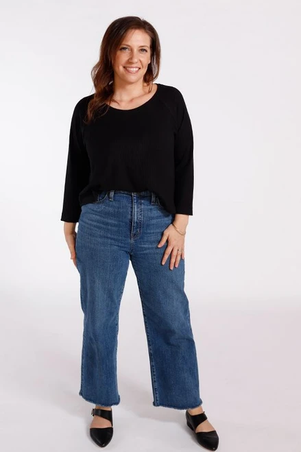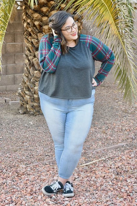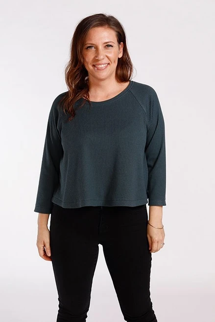 The Waterfall Raglan is a swing shape knit top or dress. There are three views: a cropped top, a ruffle top, and a ruffle dress. The sleeve has a slim fit with three length options: short, 3/4, and long sleeve.