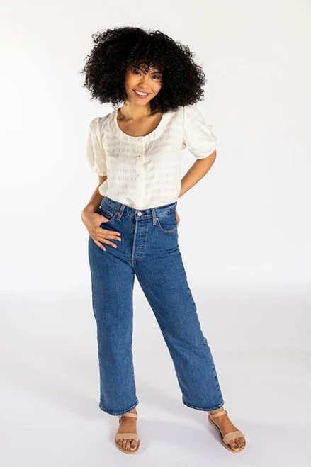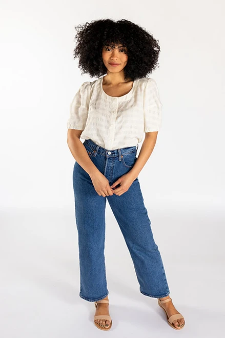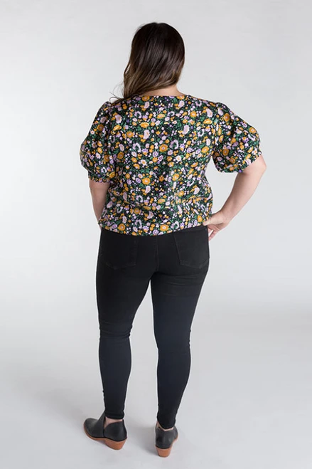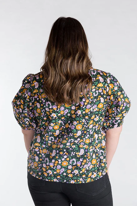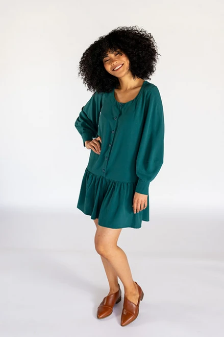 The Wren pattern is a button-front blouse and a mini dress. The mini dress has a dropped waist with a gathered skirt and is loose through the waist and hips. There are two statement sleeve options. A short sleeve with a puff cap and an elastic hem and a long sleeve with a cuff.