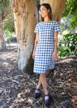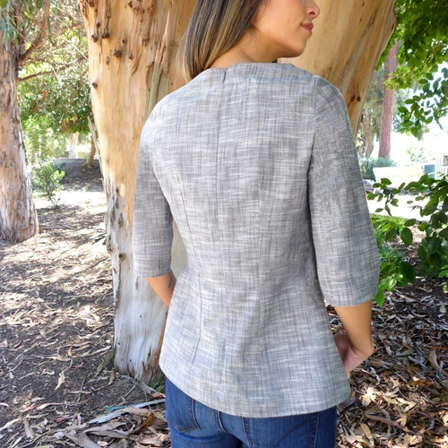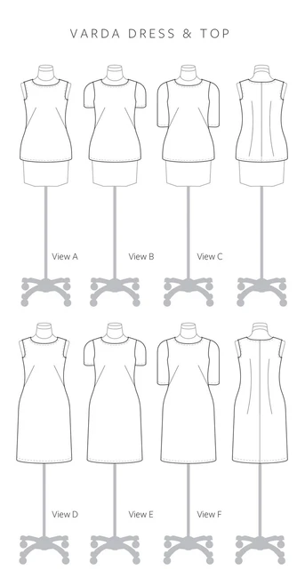 The Varda Dress & Top have the style lines of a fitted sheath, but with some ease built in for a looser fit. Choose either the dress or the top length, with one of three sleeve options, for six elegant garments. All views feature an invisible zipper closure up the center back, French darts at the bust, contour darts along the back, & a topstitched faced neckline. The sleeveless option is finished with a topstitched facing, or choose a short or elbow-length sleeve. The top hem lands at the hip, & the dress finishes right above the knee, making it both evening & office appropriate.