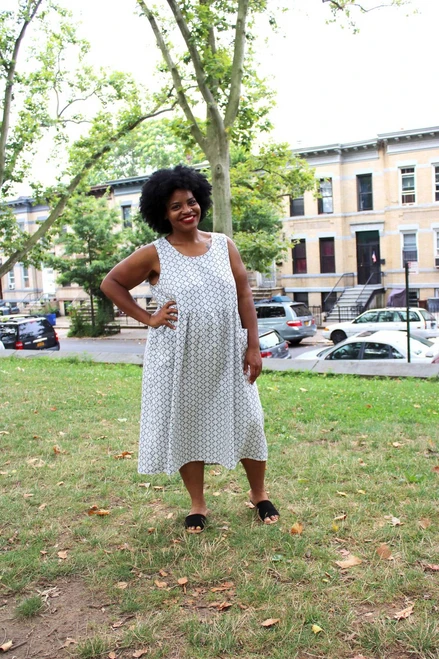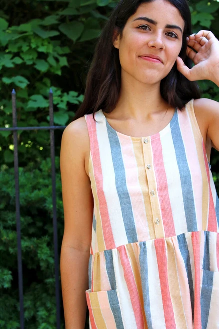 The Verano Tank is a modern tank top & dress with four views, all with the option of either a solid or button front, for a total of eight different variations. All views are sleeveless, have bust darts, & a flattering scoop front.
