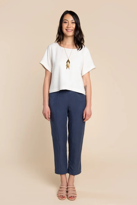 This pattern can be made with a variety of fabrics depending on the desired effect. For a more structured shape, use light to medium weight wovens such as linen, chambray, or cotton shirtings. For a drapier effect, use rayon challis, tencel, cotton voile or silk.