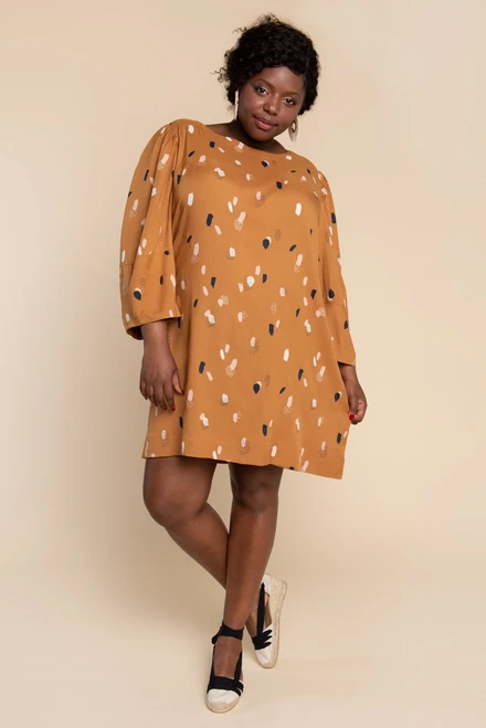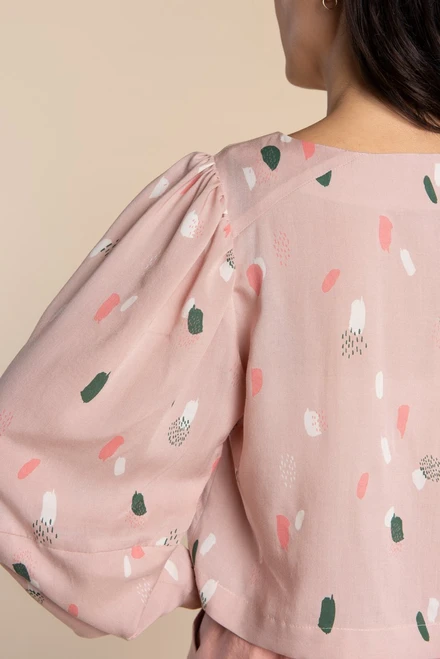 Choose between a semi-cropped top with a cuffed short sleeve (View A) or dramatic gathered long sleeve (View B). Or, make an easy fitting dress with sleek inseam pockets (View C), or without pockets (View D). All views have a slightly dropped shoulder, angled shoulder yoke and roomy fit, with a choice between an elegant bias binding or faced neckline finish.