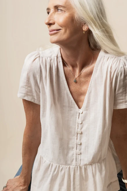 All views feature a loose-fitting V-necked bodice with a gently gathered shoulder and yoke. The slightly puffed sleeve is gathered at the shoulder; choose between a short sleeve, or a long sleeve with wrist pleats for shaping and an elastic gathered cuff. You may also choose between two interchangeable neckline finishes: a simple facing, or a bias-bound neckline with delicate rouleau button loops and buttons. View A is a button-front dress with a comfortable elastic waist, long or short sleeves, and three gathered skirt tiers. View B is a voluminous swing tunic with a gathered hip tier and long or short sleeves. View C is an elegant blouse with a faced neckline and long or short sleeves.