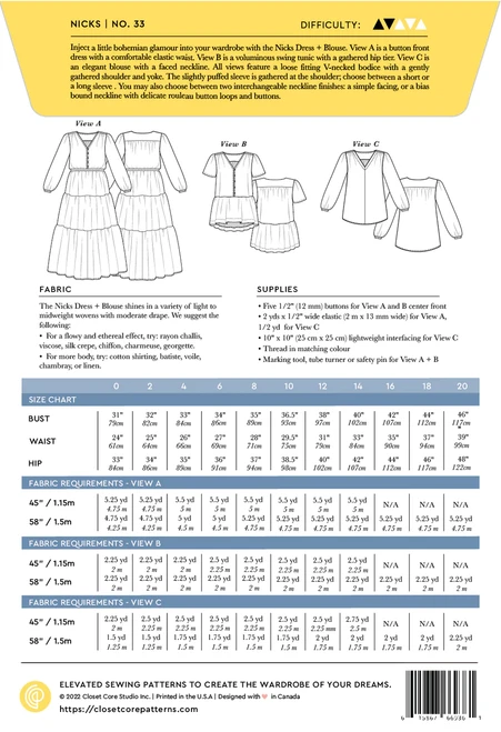 Inject a little bohemian glamour into your wardrobe with the Nicks Dress + Blouse. In multiple variations with soft gathering and delicate details, it’s satisfying to make and a pleasure to wear.