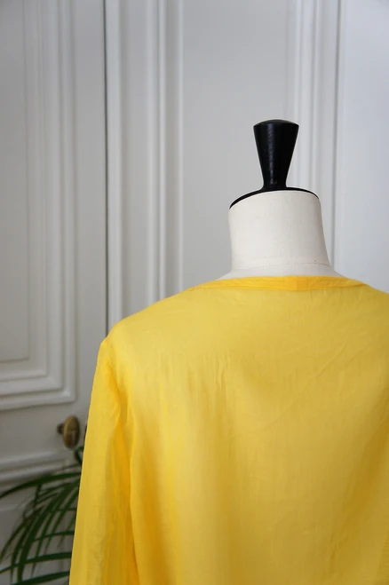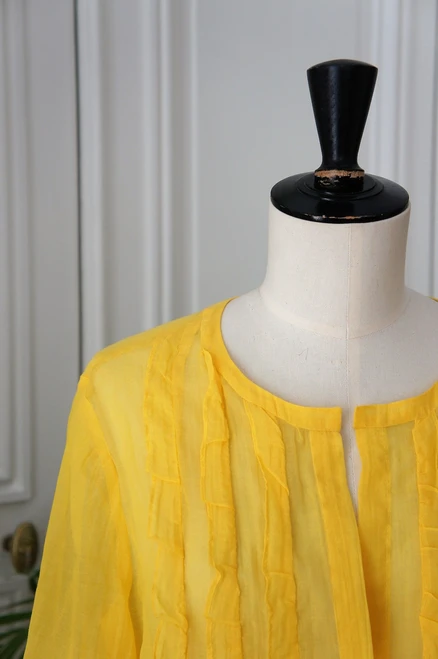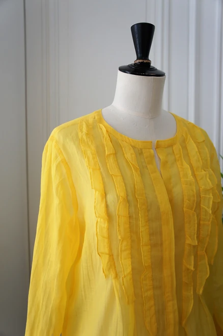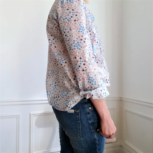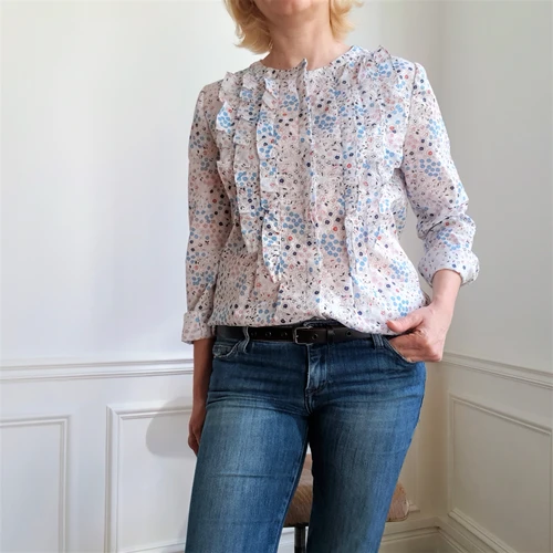 Take a look to the details: 6 gathered flounces inserted on the front of the blouse, an invisible button tab and shirt sleeves with slits at the cuffs.