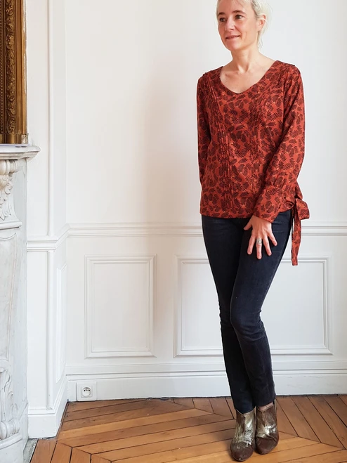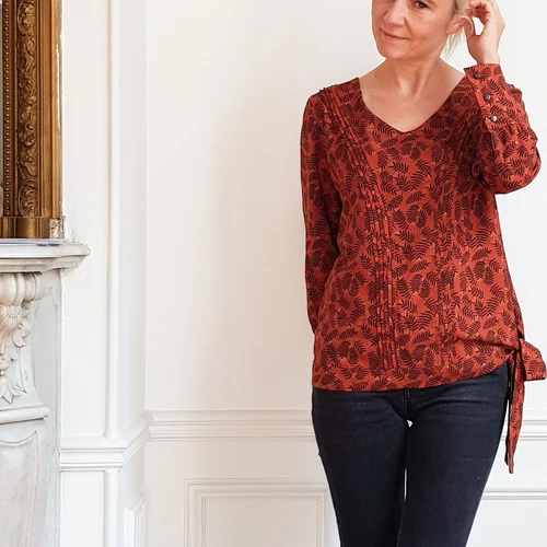 Pleats alongside a V neck, high 3 buttons cuffs, belt to be fasten on the side are 100% couture details that make this blouse unique and remarkable.