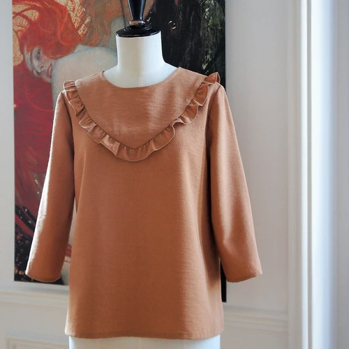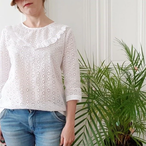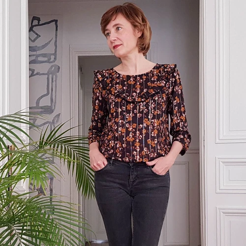 WALK LIKE ME is the little sister of the FOLLOW ME blouse with the same romantic style and its gathered flounce on the front and back, but without the complex details. With its straight ¾ sleeves it is an easy and super pretty DIY  blouse to wear on any occasion.