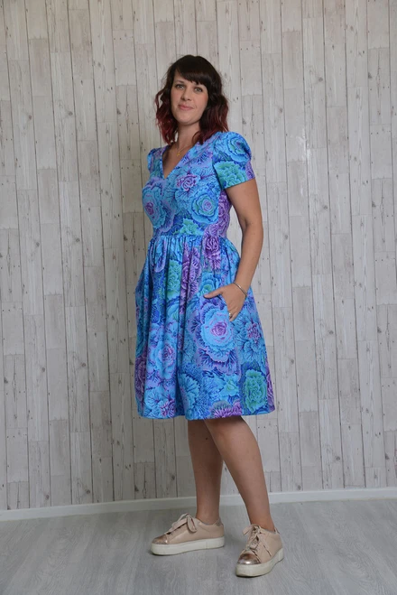 The Lotta Dress was born out of the idea of the kind of dress you might wear to a wedding or a summer party. It’s one of our more traditional style dress patterns and has the option of having small puff sleeves or being completely sleeveless, depending on what suits you best. Lotta features a very fitted bodice and a full gathered skirt, giving you an old school curvy silhouette; a matching v neck at the front and back make it that little bit more glamorous too.
