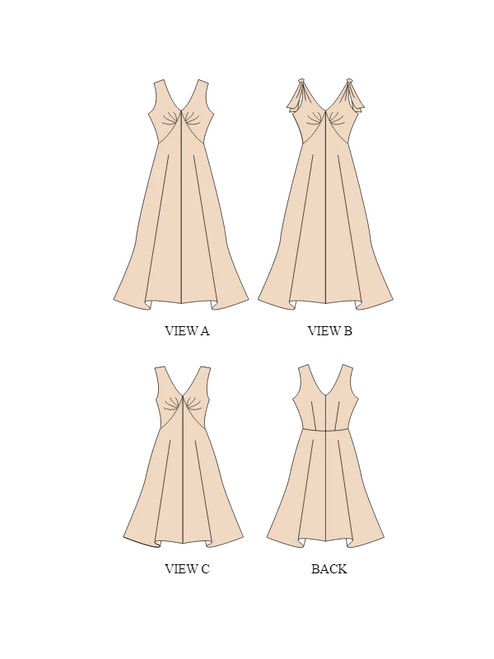 Intermediate (3/5): this dress will be fairly easy to make for anyone who made a few garments already. Bust adjustments are made easy with the included option to print the bodice front piece in your chosen cup size (from A to G). Height adjustments are possible on the skirt but will be difficult on the bodice: because of its design, it is not possible to place a lengthening/shortening line for easy adjustments.