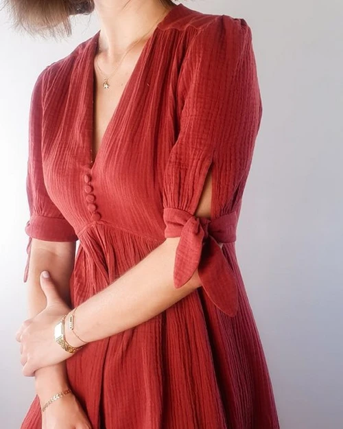Fabric choice: a large choice of woven fabrics: crepe, twill, poplin, double gauze… in cotton, viscose, polyester, linen, tencel… This pattern is also ideal for velvet, as it has shoulder gathers instead of bust darts. You will need more fabric to match prints if any.