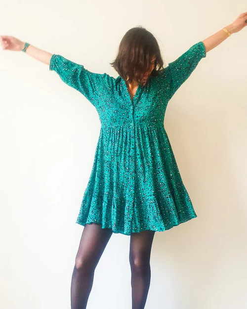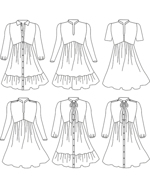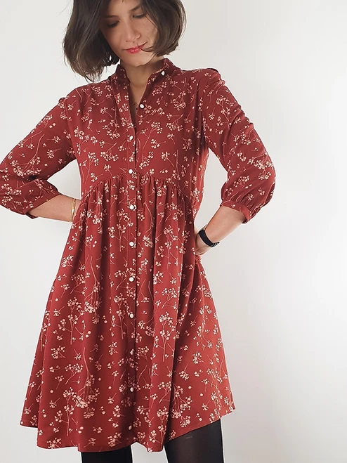 Recently updated and redrafted, French Poetry created the Pleiades 2 dress in response to the success of their Pleiades 1 pattern. Pleiades 2 features bust darts, a shirt-like bodice fit and a gathered skirt at front and back. This dress pattern includes many style variations that can be combined to make a number of unique looks from one single pattern. It includes short or long sleeves and a variety of collar and skirt options.
