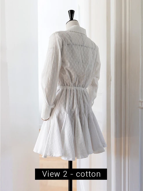 The Stella dress is a shirt dress pattern reinvented to reveal your femininity : a dreamy princess skirt contrasts with a boyish collar and hidden tie belt, giving casual, contemporary, and classy all at once. It has been designed to fit most body shapes and to mold to your daily life: get up, get dressed, laugh, twirl around, have a good dinner, drop or put on a few pounds—and all the while, don’t worry for a second about your favorite dress not fitting you anymore.