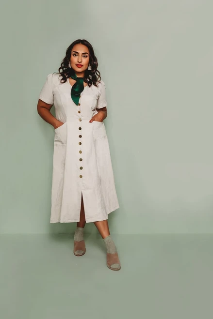 The Hughes Dress is the perfect everyday dress. It features princess seams, sleeves that gather at the cap, and a gorgeous scoop neckline. It buttons (or snaps) up the front and has an adjustable lace-up tie in the back. This pattern comes with options to cut it as a peplum top, above-the-knee length dress, or midi dress. The Hughes Dress is designed to be beautiful and flattering with design elements that make it comfortable and easy to wear.