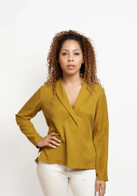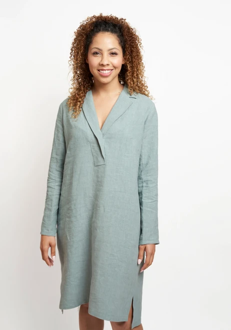 The Augusta is a cocoon shaped dress or shirt with an asymmetrical collar and mitered split hem. Choose from a short cuffed sleeve or a long straight sleeve; both are interchangeable with the dress or shirt.