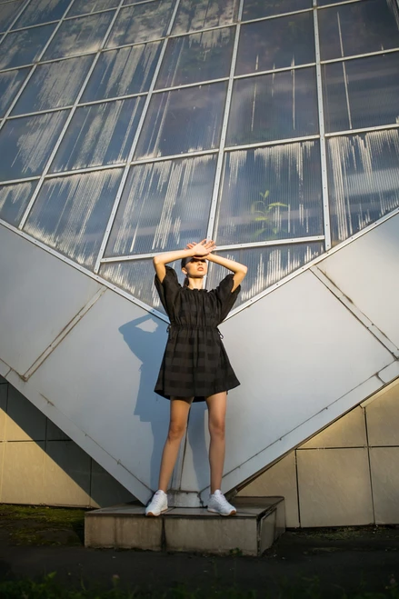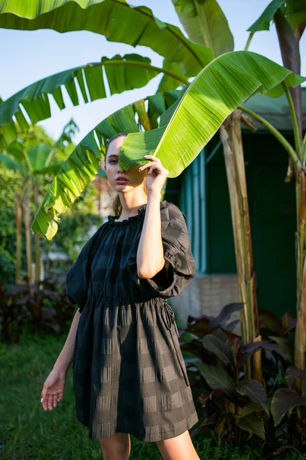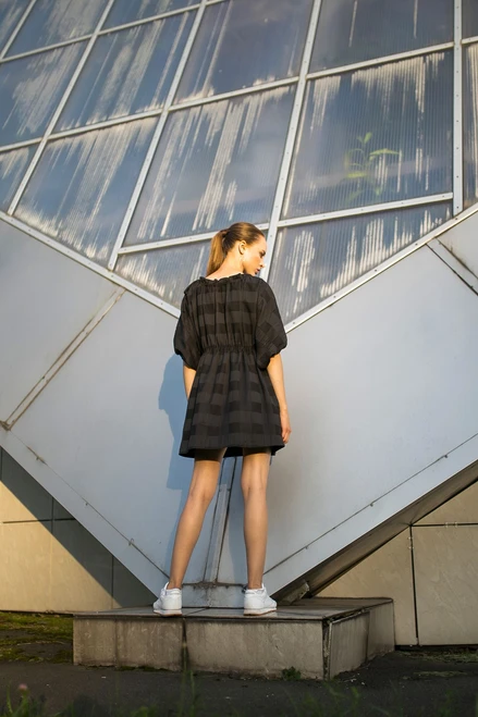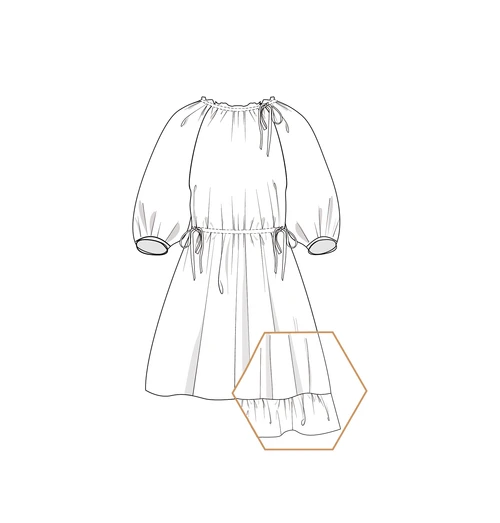 Loose dress with 3/4 raglan sleeves and bindings at the neck and waist. The ties allow you to adjust the size of the dress at the waist and to open the neckline.