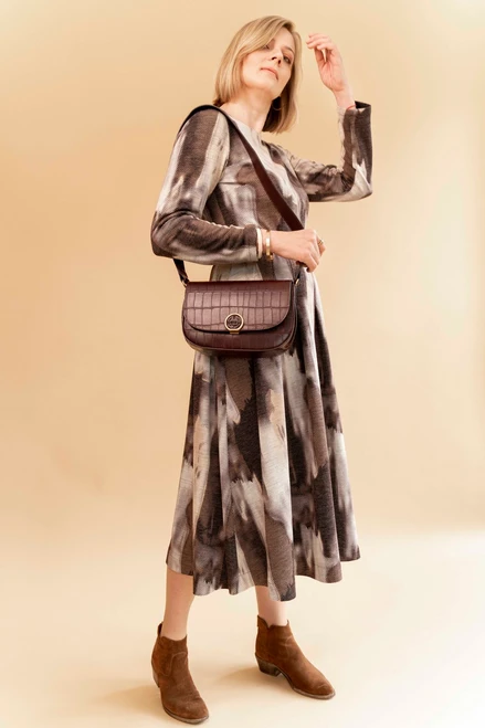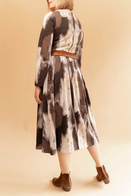 This dress has darts at the bust, waist and back. The dress’ skirt is adjusted at the hips thanks to the stitched folds around it.