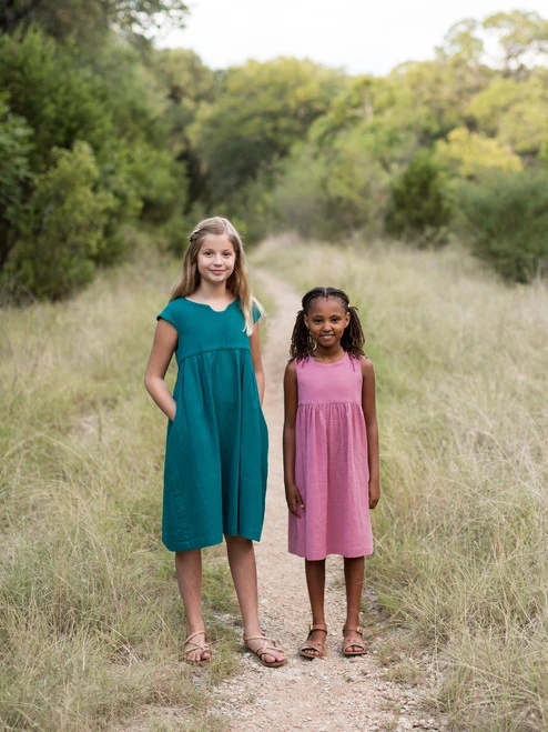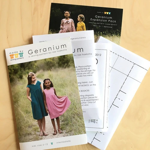 The Geranium Dress is a sweet and incredibly versatile dress pattern that includes two views. View A features flutter sleeves, a gathered skirt (top or dress length), with an optional notched neckline and an optional patch pocket. View B features faux cap sleeves, a pleated skirt (top or dress length) with side-seam pockets for sizes 6-12 years and up and an optional cutout neckline. Both views feature a lined bodice for a lovely finished effect.