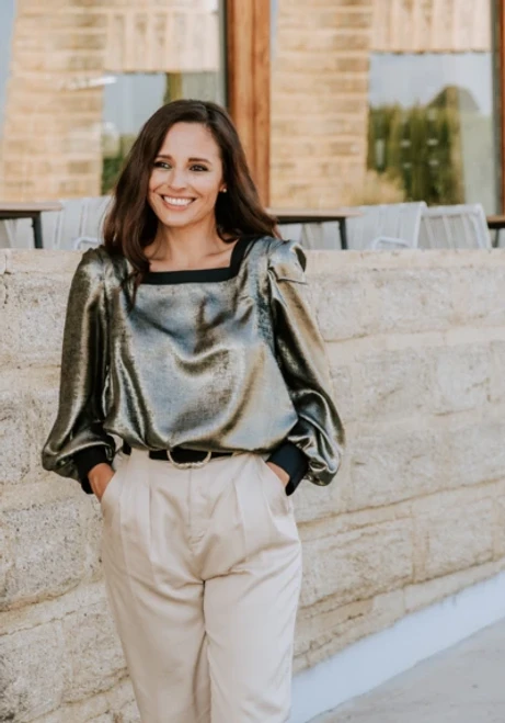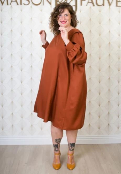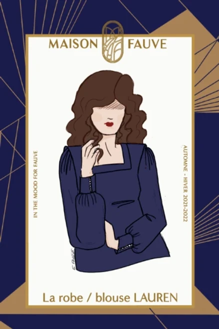 Viscose, fine woollen fabrics for blouses or cotton dresses, tencel, linen, silk and for the blouse version a pretty openwork fabric as well. Rather soft fabrics, which will flatter the work of the shoulder fold and the gathered sleeve. Recommended weight 80 to 220 g/m2 depending on the desired effect, from the very light blouse to the winter blouse in fine wool.