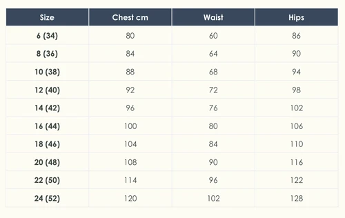 | Size | 34 | 36 | 38 | 40 | 42 | 44 | 46 | 48 | 50 | 52 |