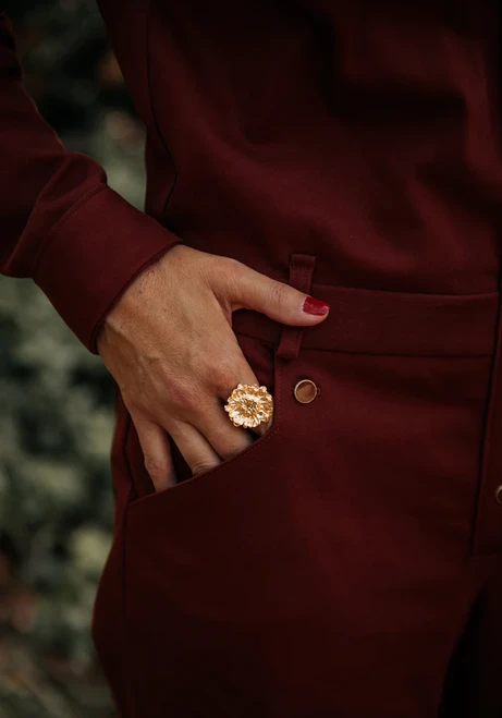 Medium-weight fabrics (around 200g/m2), such as cotton sateen, velvet, jacquard or fine wool, supple denim. A little elasticity is desirable for the jumpsuit version (between 2 and 3% elastane).