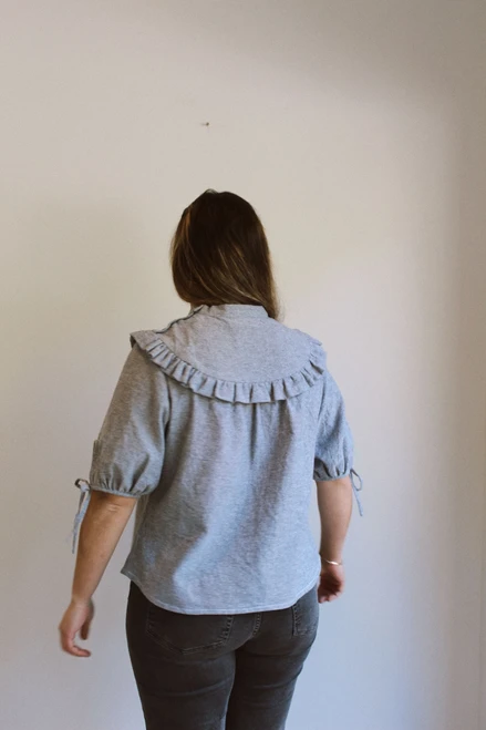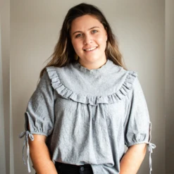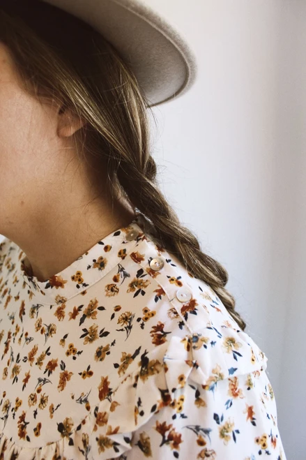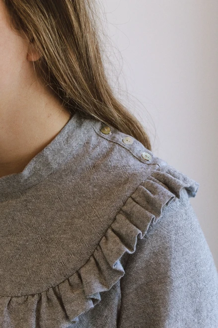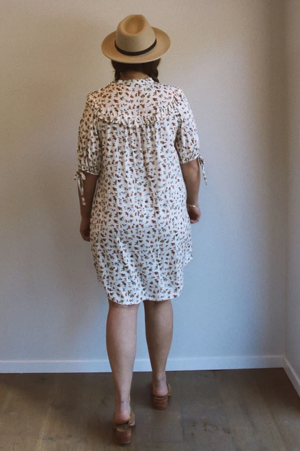 The Dua is the perfect staple piece to wear whilst relaxing at home, doing errands, throwing on for work or just grabbing a coffee or cheeky wine with your girlfriends! The Dua is a relaxing fit blouse and dress, which features a stand collar, button up shoulder placket closure, front and back bib with ruffle detailing, front and back gathering under the bib, a flattering curved hemline and gathered sleeves with keyhole detailing and ties. The Dua dress sits just above the knee and can be cinched in at the waist with a waist tie or left loose and relaxed.
