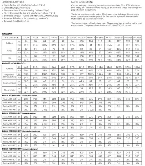 This pattern comes with plenty of ease. Choose your size according to the full bust measurement. The pattern is drafted for a 172 cm (5’8”) tall person.