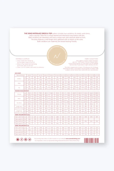The Sisko pattern includes two variations: An elastic waist dress, and a crop top. Sisko has a unique layered and interlaced wrap bodice with ties. Both variations are sleeveless and have a scoop neck and a keyhole detail at front. The dress features a midi-length skirt, gathered with an elastic at the waist. Both variations are maternity and breastfeeding friendly.