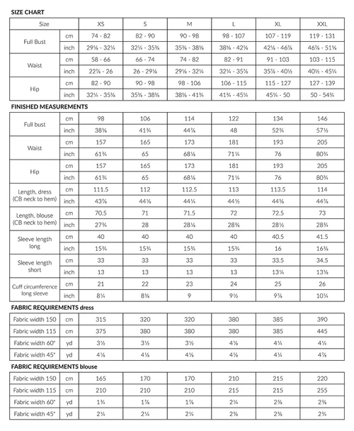 The Syli dress and blouse are relaxed everyday garments with a loose fit. Both variations feature a gathered bodice, a shallow tuck across the chest and a hemline that dips slightly longer in back. The neckline is finished with binding with a back vent secured by ties. The calf-length dress has two deep tucks around the hemline of both the skirt and sleeves as well as in-seam side pockets. The ¾-length sleeves of the dress have gathered ends finished with binding and ties. The blouse is hip length and has straight ½-length sleeves with turned hems.