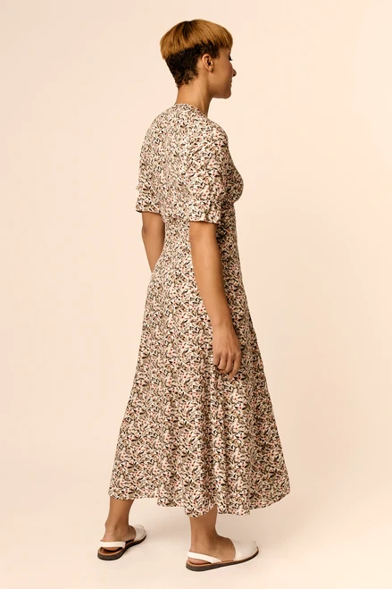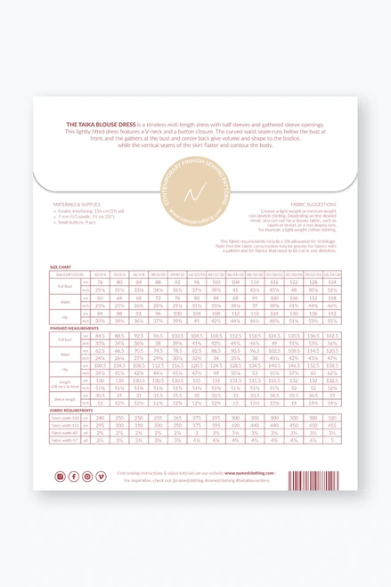 Taika is a timeless midi-length blouse dress with half sleeves and gathered sleeve openings. This lightly fitted dress features a V-neck and a button closure. The curved waist seam runs below the bust at front, and the gathers at the bust and center back give volume and shape to the bodice, while the vertical seams of the skirt flatter and contour the body.