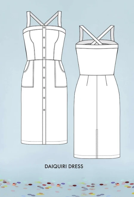 The Daiquiri Dress is a flexible wardrobe staple, perfect for warm summer days and year-round layering. This dress pattern is for the sewer who is ready for a challenge. With a little bit of work and a lot of topstitching, you’ll be rewarded with a stylish denim dress that will have your friends saying, “OMG, you made that?” The Daiquiri is a fitted denim dress, with a princess-seamed bodice and a centre-front placket. There are handy patch pockets on the hips, and a slit at centre-back for ease of movement.