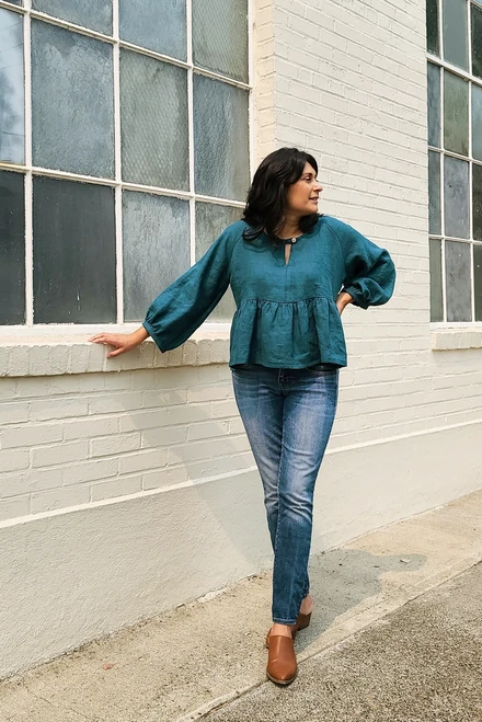 The Romey Gathered Dress & Top pattern is inspired by Sew House Seven’s popular Remy Raglan pattern. Beginning with the signature (Version #2) Remy keyhole neckline and loose fit, we shortened the waistline into an elegant empire waist with a gathered skirt or peplum and billowy gathered sleeves at bracelet length. Both dress versions include patch pockets because who doesn’t love pockets?!