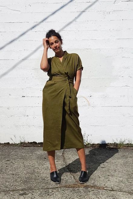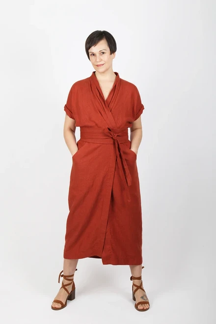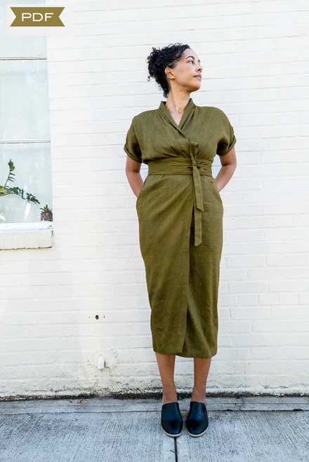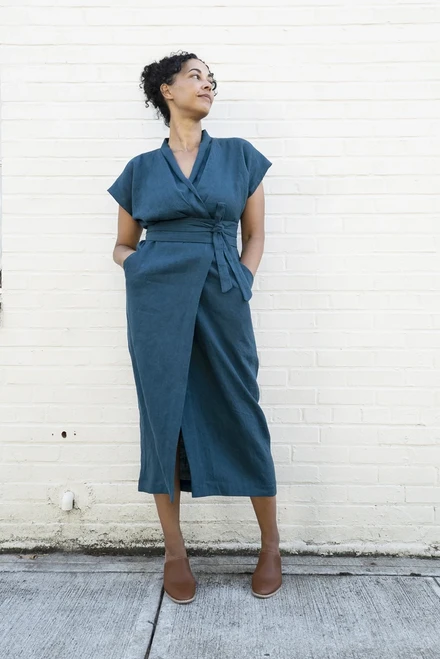 The Wildwood Wrap Dress is perfect for the office, parties, weddings or when you just feel like wearing a dress. It is a true wrap dress, although with a detached, obi inspired belt. The beauty of this dress is created by the drape of the shawl collar and enhanced by the waist and shoulder pleats. It has generous front pockets, and a slim skirt with a wide, faced hem. French seams are used to construct the upper bodice so version B looks pretty once the sleeves are rolled up. Choose a below the knee hem or longer midi-length hem.