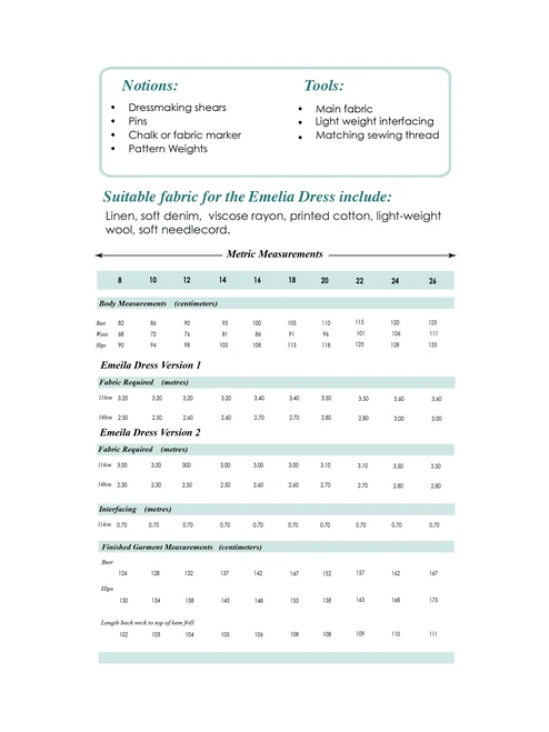 | Suitable Fabrics | Linen, Soft Denim, Viscose Rayon, Printed Cotton, Lightweight Wool, Soft Needlecord |