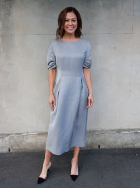The reverse inverted pleats give this designer dress its unique shape. This dress has a fitted bodice along with a dropped shoulder. The shape of the engineered sleeve is created by the under-sleeve tucks. The essential side pockets and mid-calf length give this dress its designer feel.