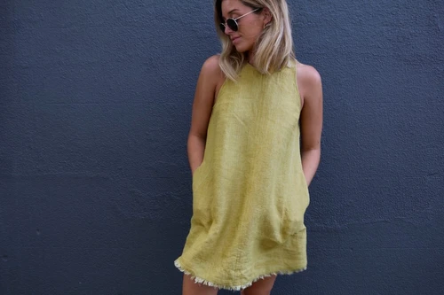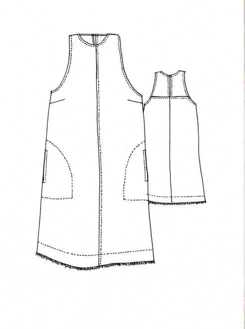 The Bondi Dress is a sleeveless style featuring a high neckline, cut away armholes, bust darts, side pockets, centre front/back seam and back yoke with neck opening. The gently flared hem is finished with a facing and an optional fringe edging. This perfect summer style comes with two length options – longer length A and shorter length B.