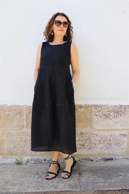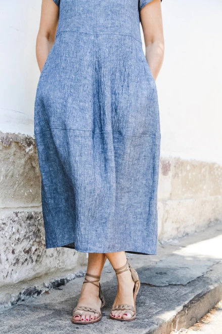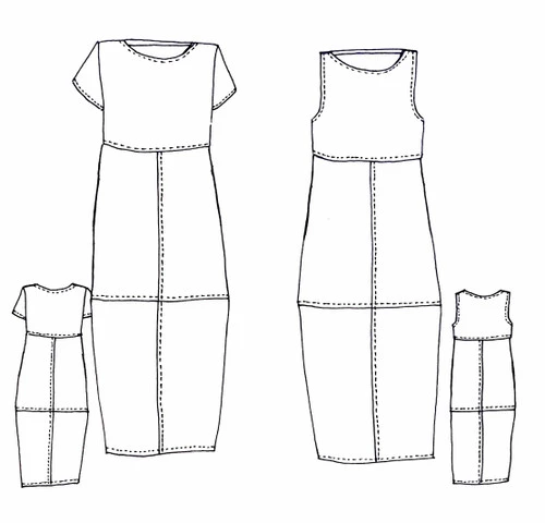 This loose dress features a bodice that sits at high waist and a panelled, lantern-shaped skirt with side pockets. It can be made up in either a short-sleeved (A) or sleeveless (B) version. The Eva Dress is designed to be simple and stylish garment and makes for a comfortable and cool addition to your summer wardrobe. It’s best made up in medium weight crinkle and plain linens, textured cottons and cotton blends. For layering in the cooler months, Eva can also be made up in a wool crepe.