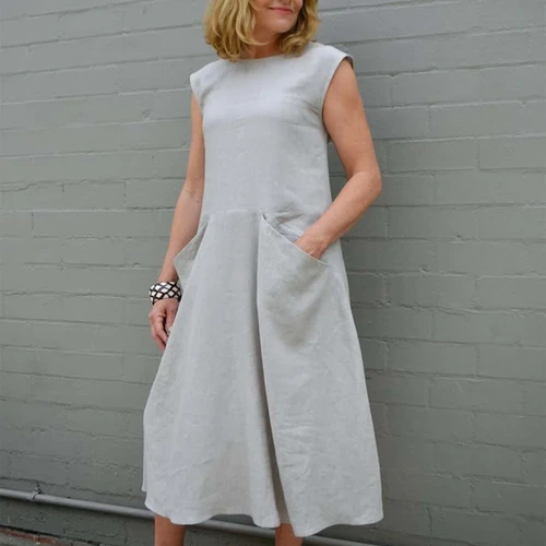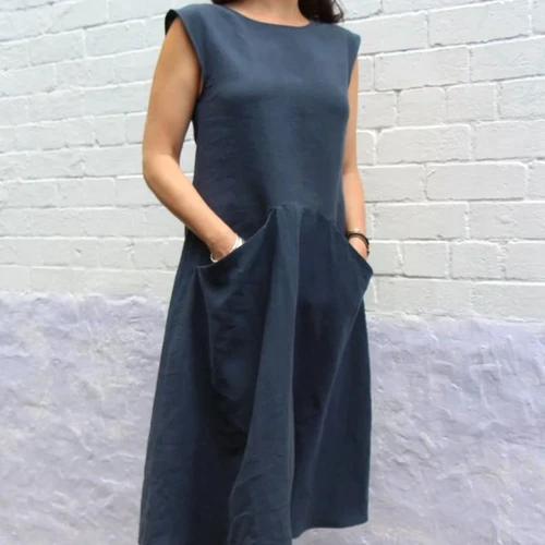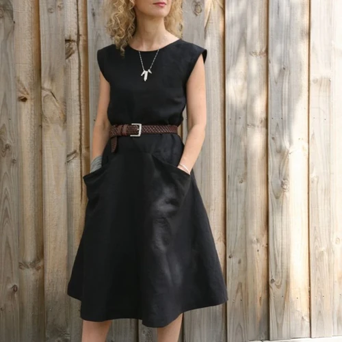 The Pia Dress a pull-on dress designed with extended shoulder sleeves and exaggerated pockets. The comfortable, flattering style is shaped without being fitted, and features a wide flared skirt allowing it to be worn loose or belted.Â