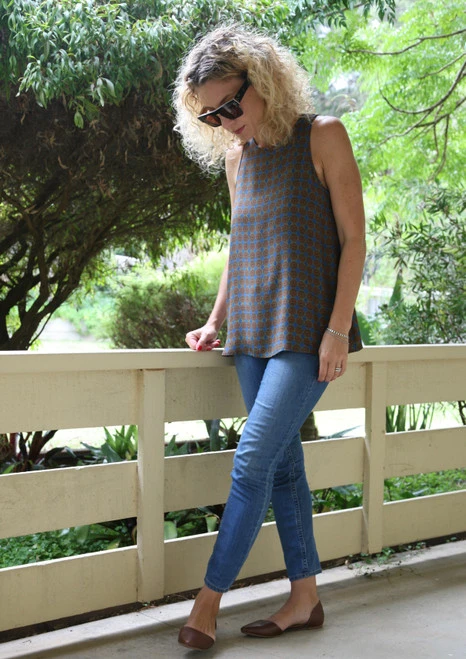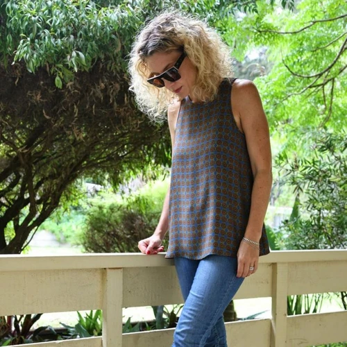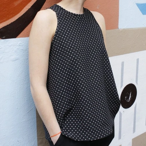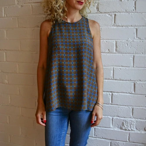 This simple sleeveless top/dress features a high neckline, cutaway armholes with self binding on armholes and neckline plus keyhole back opening. The style is slightly flared at the hemline and makes a perfect floaty garment for the warmer months. Suitable fabrics for this top/dress include light to medium weight linens or linen blends, rayons, viscose and silks.