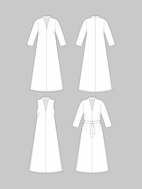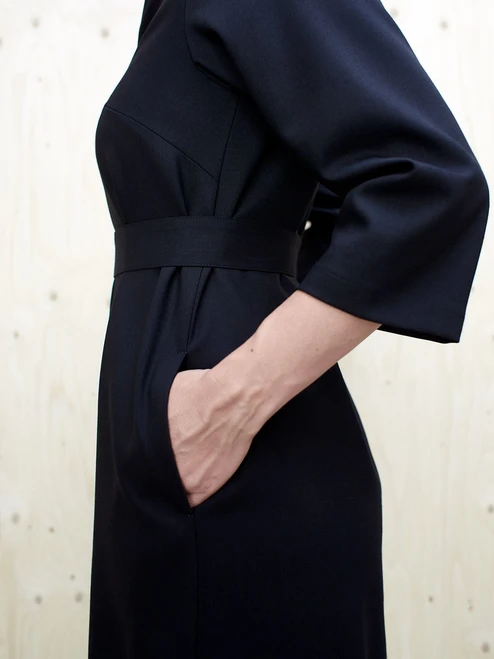The V-neck dress has a narrow V-shaped neckline that continues as a collar in the back of the neck. It features 3/4 long sleeves, pockets in side seams and an optional belt. The pattern includes parts and instructions to make the model with or without sleeves.