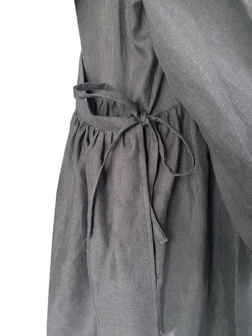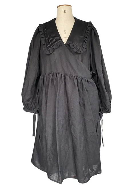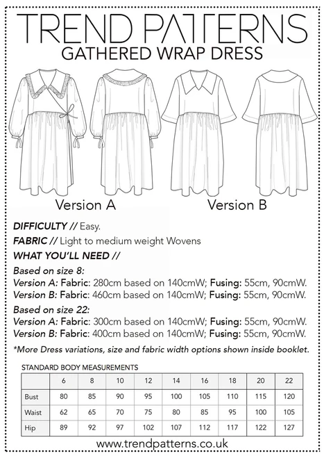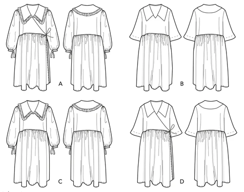This pattern has 2 differing versions that are both illustrated in the booklet, with an option for two other styles, by mixing up the pieces, also explained . Version A is the Wrap version which uses self made ties to fasten, or Version B, a plain gathered skirt and single front bodice with no opening that you can simply chuck on over your head.