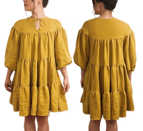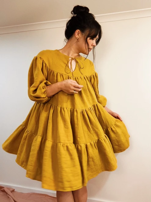 Featuring a tie neck yoke, balloon sleeves and three voluminous tiers (with pockets, of course!)